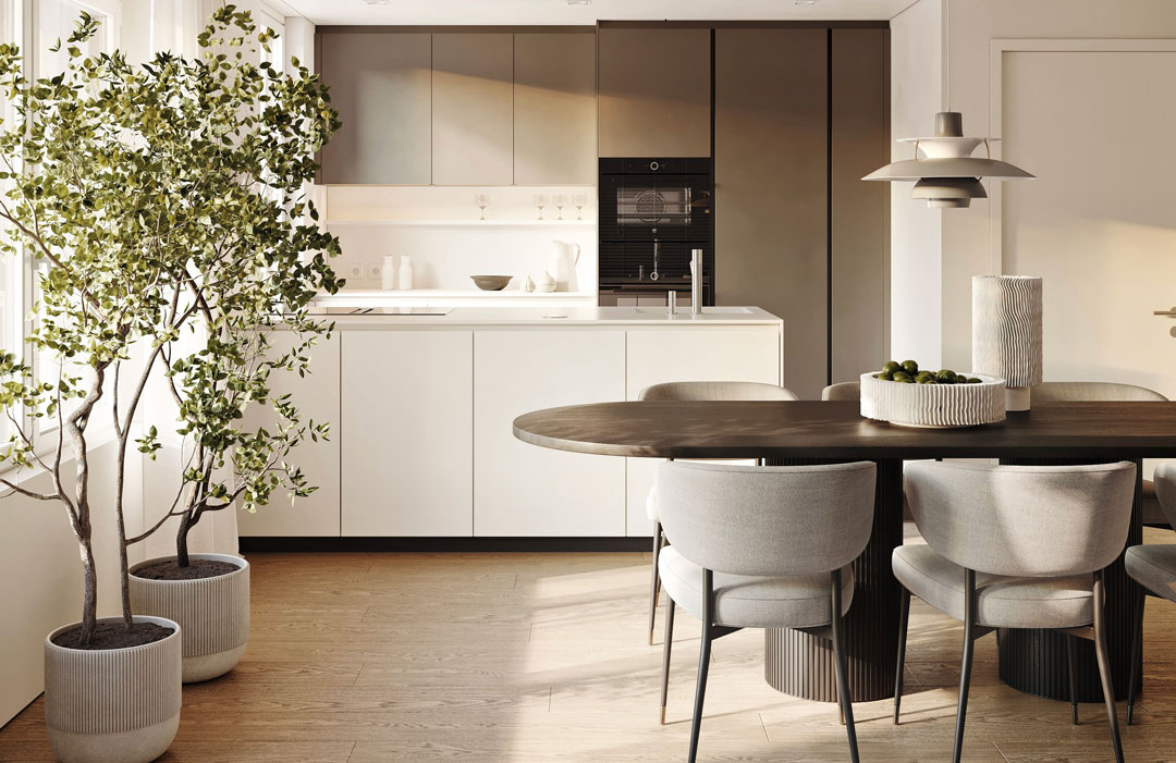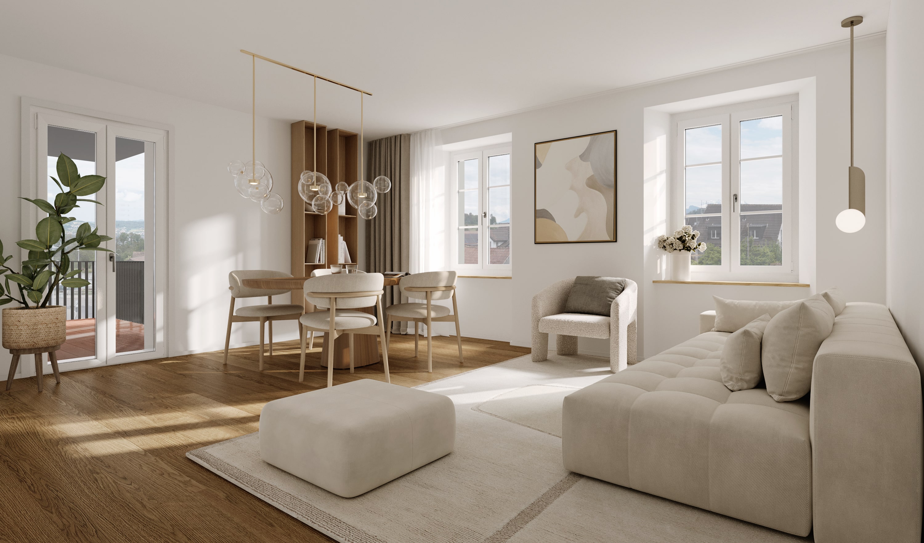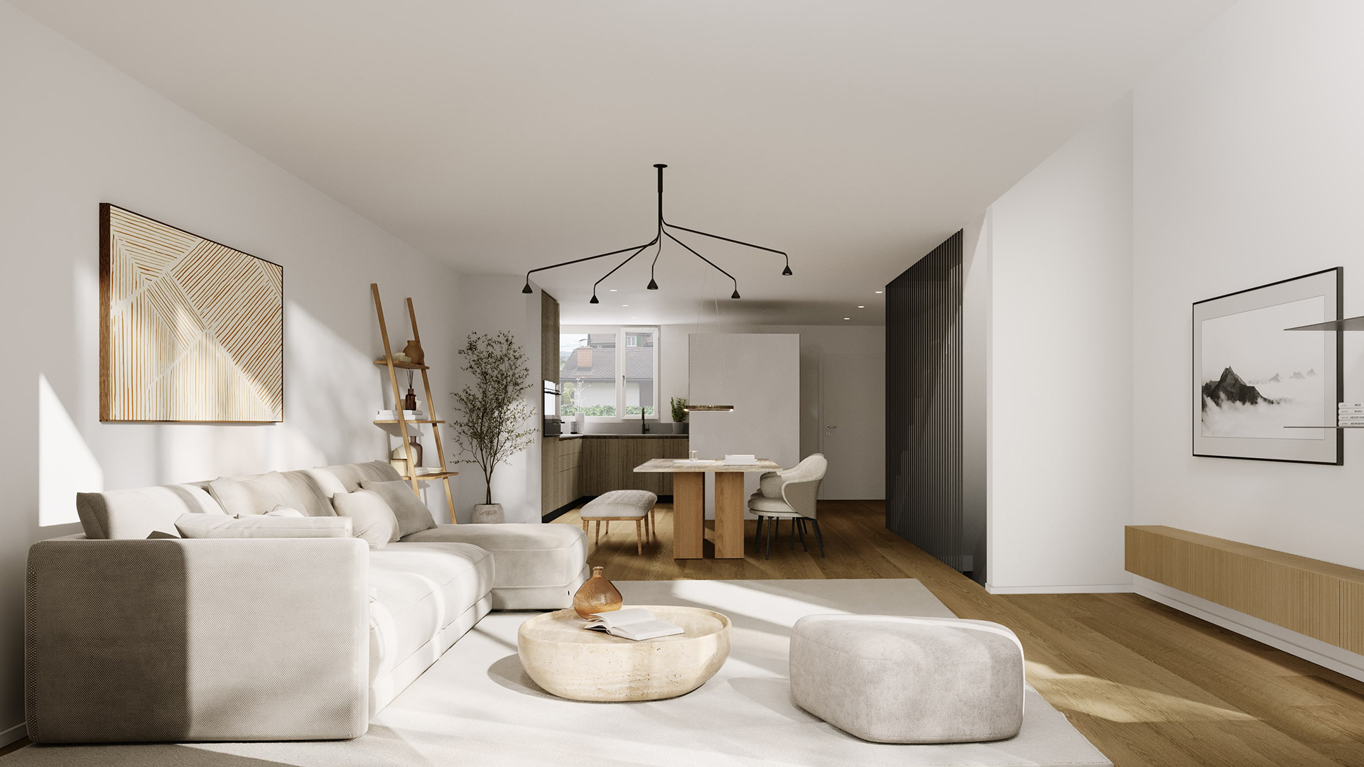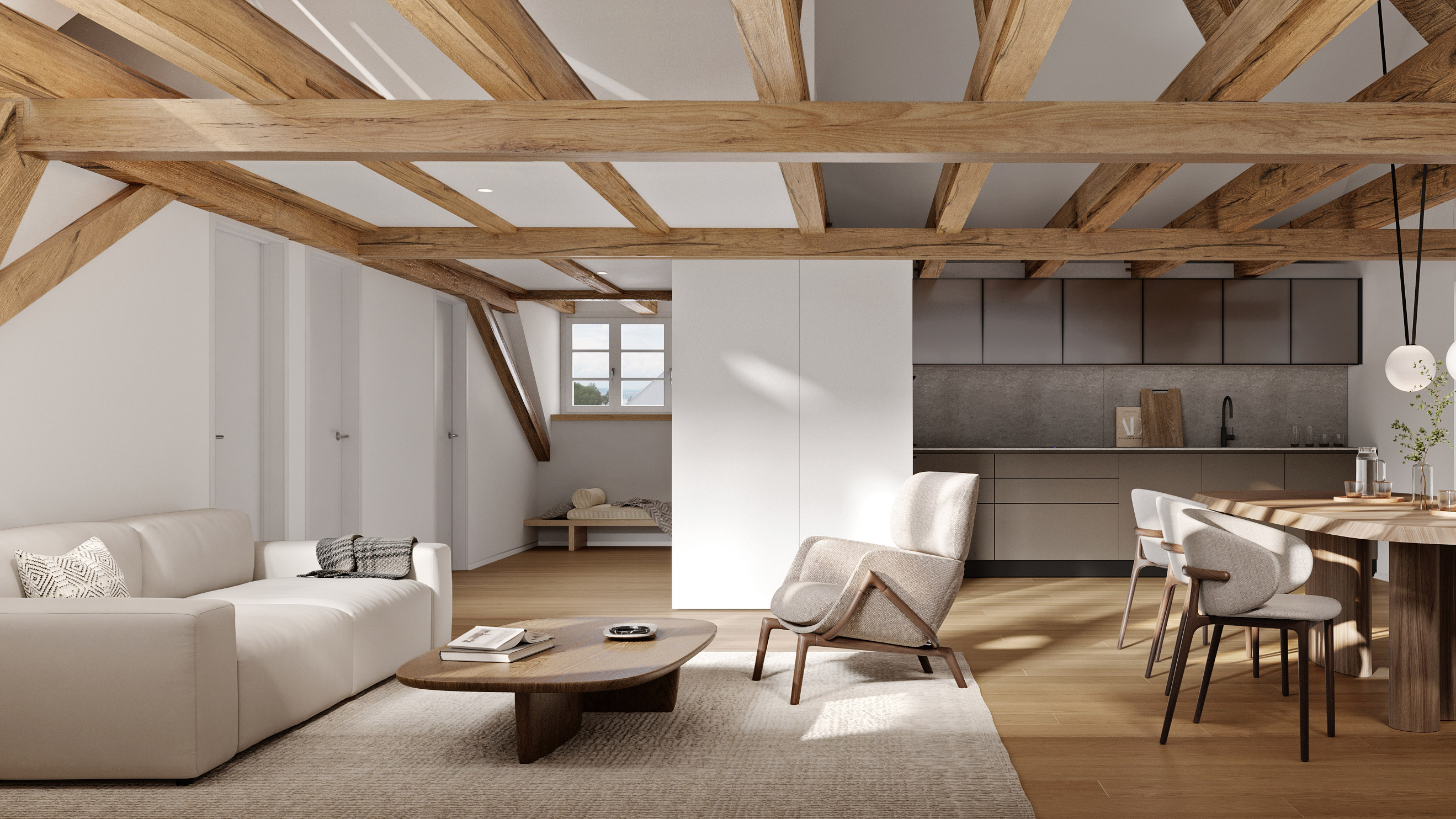 Die Innenräume sind hell, schlicht und zeitlos gestaltet. Das durchgehende Parkett verleiht dem Zuhause Wärme und eine natürliche Atmosphäre, während die puristischen Wandflächen Ruhe und Klarheit ausstrahlen. Die Küche ist funktional, hochwertig ausgestattet und fügt sich harmonisch ins Wohnkonzept ein. Ein Ort, an dem man gerne zusammen kocht, das Beisammensein geniesst und den Alltag mit Leichtigkeit erlebt.